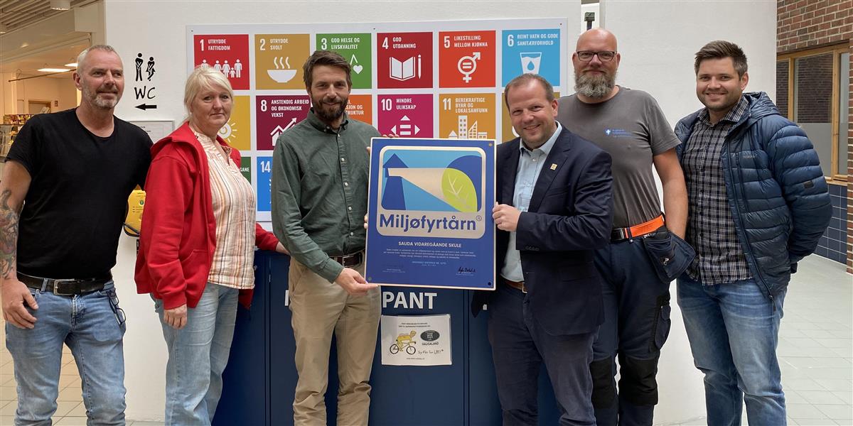 Sauda vgs vert sertifisert som Miljøfyrtårn. Frå venstre: hovedverneombod, administrasjonsleiar, rektor, Asbjørn Birkeland (Ordførar Sauda Kommune), driftsleiar og Roger Birkeland (konstituert kommunalsjef næring og samfunn).