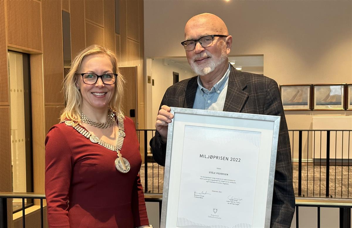 Ståle Pedersen frå Karmøy er tildelt fylkeskommunens Miljøpris 2022. Her med fylkesordførar Marianne Chesak.  - Klikk for stort bildeStåle Pedersen frå Karmøy er tildelt fylkeskommunens Miljøpris 2022. Her med fylkesordførar Marianne Chesak. Øyvind Nesvåg