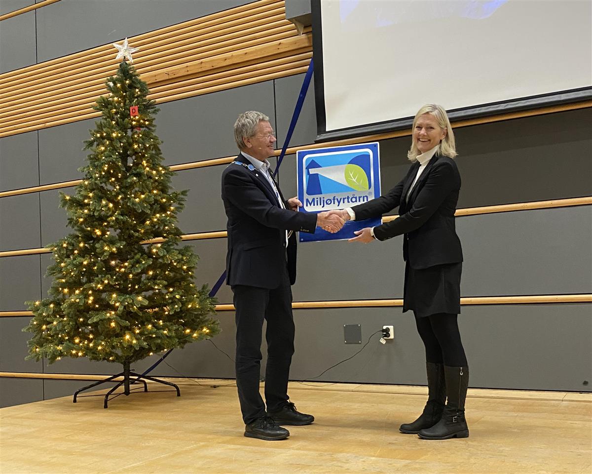 Ordfører i Haugesund Arne-Christian Mohn delte ut diplomet til miljøfyrtårnansvarlig ved Karmsund videregående Ruth Mariann Hop.