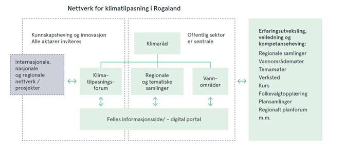 Nettverk for klimatilpasning i Rogaland er et viktig grep i oppfølging av Regionalplan for klimatilpasning i Rogaland. Det er opprettet to nye samhandlingsarenaer; klimaråd og klimatilpasningsforum, mens flere eksisterende arenaer skal styrkes.
