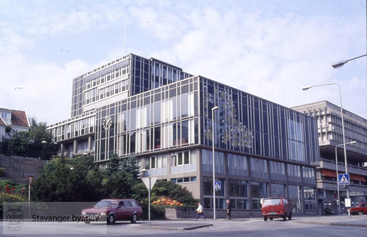 Rådhuset i Stavanger, som nå er under totalrenovering, var eit godt døme på 60-talsarkitekturen i byen, her fotografert i 1990. Foto: Ukjent fotograf/Stavanger byarkiv