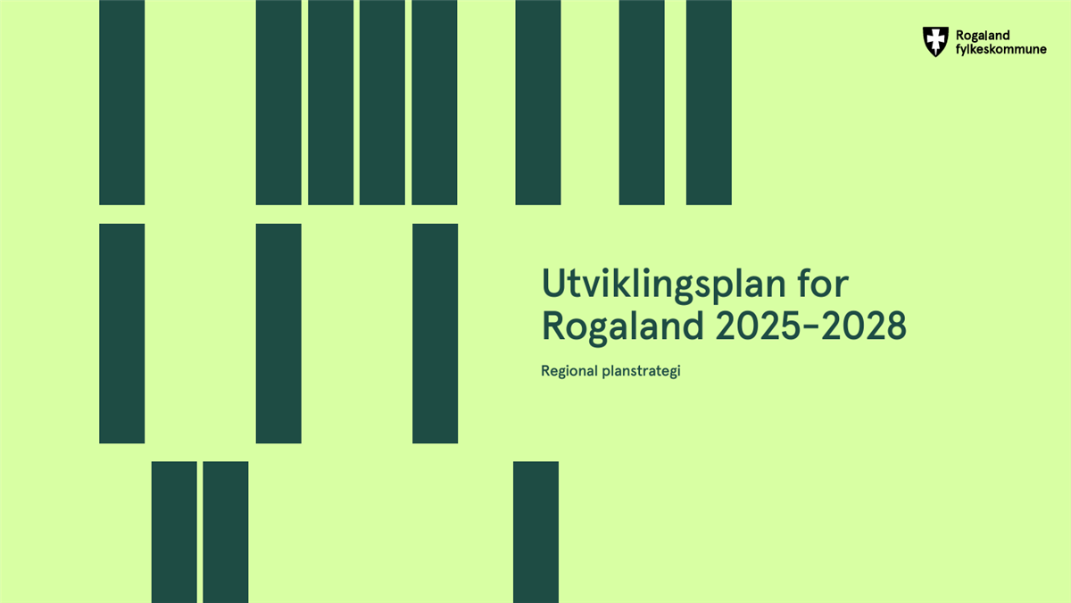 Utviklingsplan for Rogaland 2025-2028 - regional planstrategiUtviklingsplan for Rogaland er fylkeskommunens øverste styringsdokument for perioden 2025-2028. Den setter kursen for samfunnsutviklingen i Rogaland med visjonen "Sammen for et grønt og attraktivt Rogaland" Utviklingsplan for Rogaland 2025-2028 Planen ble vedtatt i fylkestinget i Rogaland 29. oktober 2024. Les Utviklingsplan for Rogaland 2025-2028 som nettdokumentLast ned Utviklingsplan for Rogaland 2025-2028 som fil (PDF, 7 MB)Planen kort fortalt Utviklingsplan for Rogaland er fylkeskommunens øverste styringsdokument for perioden 2025-2028. Den gir strategisk retning til samfunnsutviklingen i fylket, bidrar til å samordne innsats og virkemiddelbruk i felles retning og mobiliserer regionale aktører rundt felles mål. Planen har fire langsiktige mål: Attraktive lokalsamfunn, tettsteder og byer Konkurransedyktig region Helsefremmende og inkluderende samfunn Klimaomstilling og livskraftig naturmiljø Hvert av disse målene har tre innsatsområder som skal stå i fokus i perioden 2025-2028. Planen gir også føringer for at plansystemet i Rogaland skal samordnes, forenkles og tydeliggjøres. Den presiserer hvilke planer og strategier som skal være gjeldende for den kommende perioden og hvilke nye planer som skal utarbeides. Oppfølging av planen Fylkeskommunen følger opp planen gjennom tre hovedspor: Forankring av utviklingsmål i organisasjonen Forenkling og samordning av plansystemet Prioritering av utviklingsmål i virksomhetsstyring og ledelse Utviklingsplan = regional planstrategiFylkeskommunen skal utarbeide regional planstrategi i begynnelsen av hver valgperiode, jfr plan- og bygningslovens § 7. Oppgaven er å beskrive utviklingstrender i fylket, definere ønsket samfunnsutvikling, og hva samfunnsaktørene i Rogaland må gjøre for å oppnå den. Fylkestinget har vedtatt å kalle dokumentet for "Utviklingsplan for Rogaland", da dette gir et bedre bilde av hensikten med dokumentet. Vil du se denne videoen må du godkjenne funksjonelle informasjonskapsler. Sist endret 11.02.2025 11.30