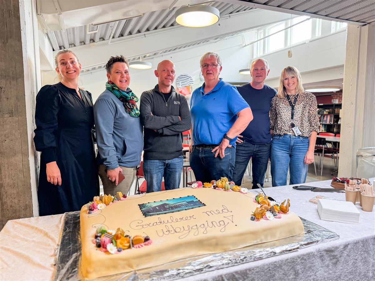 Seks vaksne poserer framfor marsipankake. Foto - Klikk for stort bildeLærarar på Strand er fornøgde med at dei skal starta bygging.