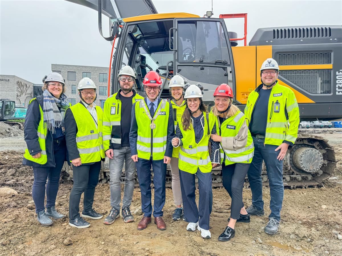 Folk med hjelm og signalgul vest står framfor gravemaskin på byggjeplass og smiler. - Klikk for stort bildeNo er første stikk teke i jorda for Strand vidaregåande skule. Tilsette, fylkesordførar, elevar og entrepenørar var med på markeringa.