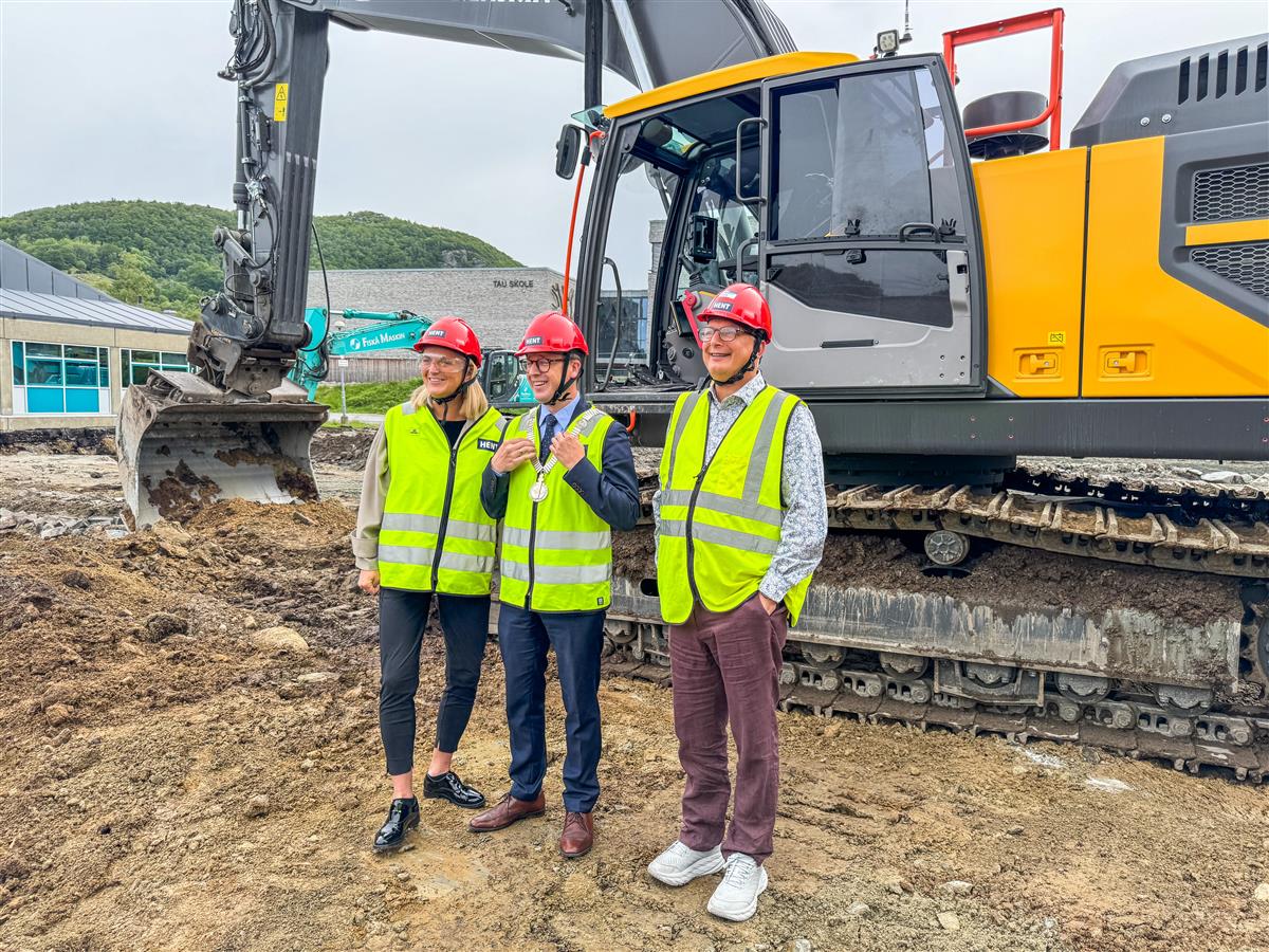 Tre personar smilar til kamera med vest og raud hjelm. Foto - Klikk for stort bildeLeiar i opplæringsutvalet, Anne Kristin Bruns, fylkesordførar Ole Ueland og rektor på Strand vidaregåande, Erik Danielsen var med på spadestikket.