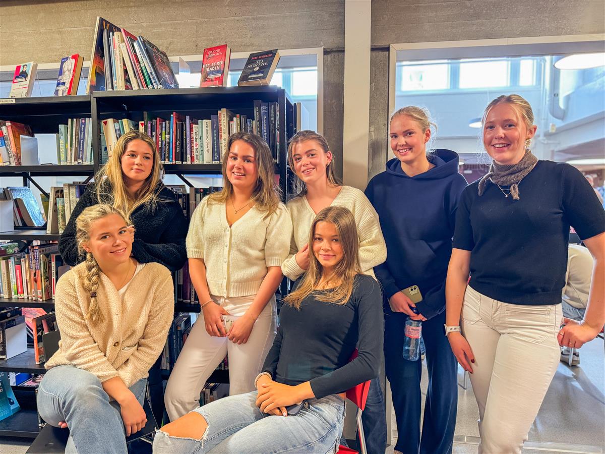 Sju jenter sit i fellesområde og smiler til kamera. Foto - Klikk for stort bildeElevane på Strand er også fornøgde med at dei skal starta bygging.