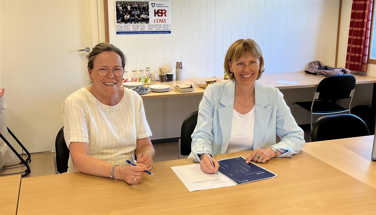 Anne Margrethe Skretting, seksjonsleder Bussveien 1 Rogaland fylkeskommune (t.v.) signerer kontrakten med Randi Birgitte Svånå, Divisjonsdirektør Asplan Viak (t.h.)– Nå er vi endelig i gang med planleggingen av den neste lange strekningen av Bussveien, som går fra Mosvatnet til Kvernvik. Asplan Viak har fått oppdraget med en totalverdi på 67,8 millioner kroner, i hard konkurranse med fem andre tilbydere, sier Anne Margrethe Skretting, seksjonsleder for Bussveien 1 i Rogaland fylkeskommune.
