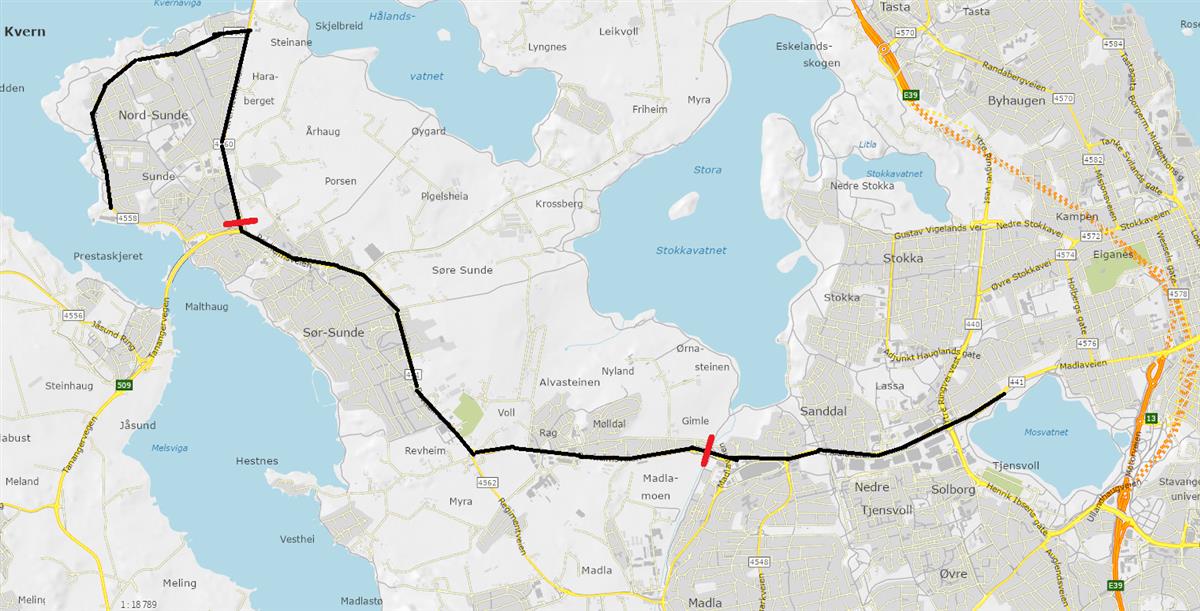 Strekningen fra Mosvatnet, via Sundekrossen, til Kvernevik er på rundt ni kilometer, og deles inn i tre separate planer som er tenkt å ha parallelle planprosesser. Omtrentlig grensesnitt for hver av planene er markert med rød strek på tvers av strekningen.
