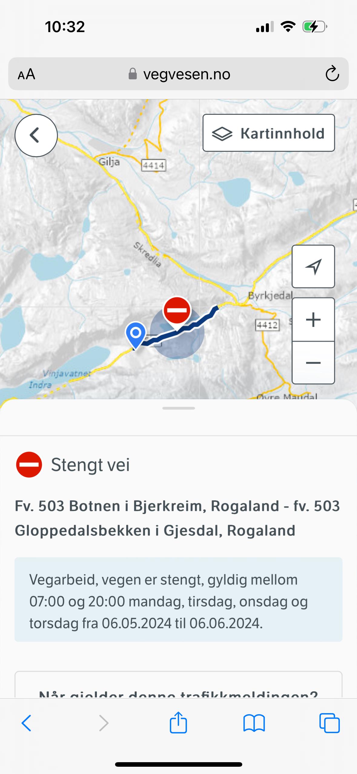 – Det er dessverre vanskeleg anslå kor lang tid det tek å bli ferdig, på grunn av vêret og andre forhold. Fylkesveg 503 Gloppedalsvegen blir framleis stengd på dagtid måndag til torsdag mellom klokka 07.00 og 20.00, alle dagar vêret tillèt arbeid i fjellsida, seier Frode Reed byggjeleiar i Rogaland fylkeskommune.