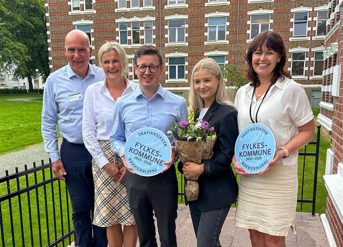 Til venstre står Harald Heierås og Elisabeth Wallace Håland fra Trygg Trafikk, fylkesordfører Ole Ueland Hannah Orstad Johnsen og fylkesdirektør Gunn Claire Westad– Jeg er glad og kry for at vi er godkjent. Trafikksikkerhet har i mange år vært høyt på agendaen til fylkeskommunen, og administrasjonen har jobbet godt for å få denne godkjenningen, sa fylkesordfører Ole Ueland da han mottok sertifiseringen på vegne av Rogaland fylkeskommune.