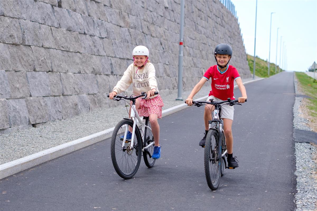 jente og gutt sykler - Klikk for stort bildeMarte Eriksen og Herman Soldal er elever i sjette klasse ved Håland skole. De sykler gjerne til skolen nå når de har fått trygg og fin gang- og sykkelvei. Øyvind Nesvåg