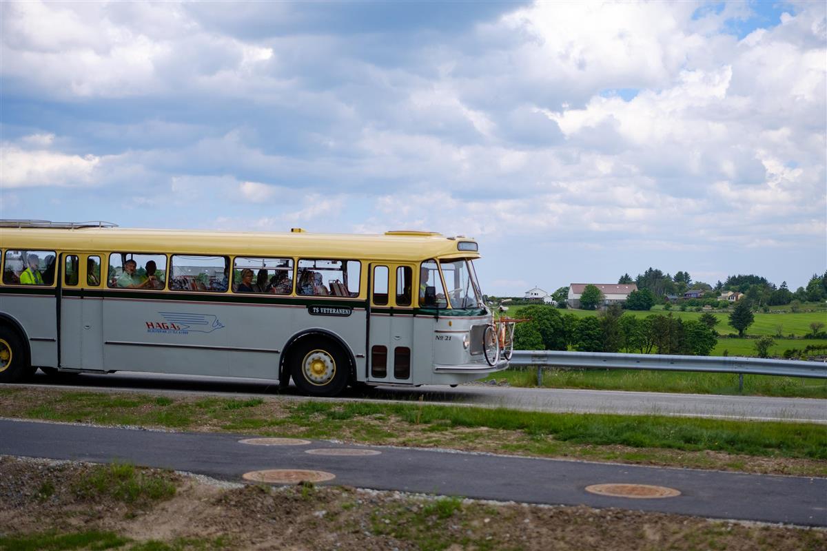 Stangeland Maskin, som har vært entreprenør i prosjektet, stilte med veteranbuss for gjestene som ønsket å ta den nye gang- og sykkelveien nærmere i øyensyn.