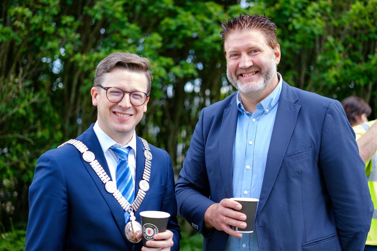 to menn smiler og ser i kamera - Klikk for stort bildeFylkesordfører i Rogaland, Ole Ueland og enhetsleder for prosjekt i Rogaland fylkeskommune, Harald Bøhn smilte om kapp med sola i Sola. Øyvind Nesvåg