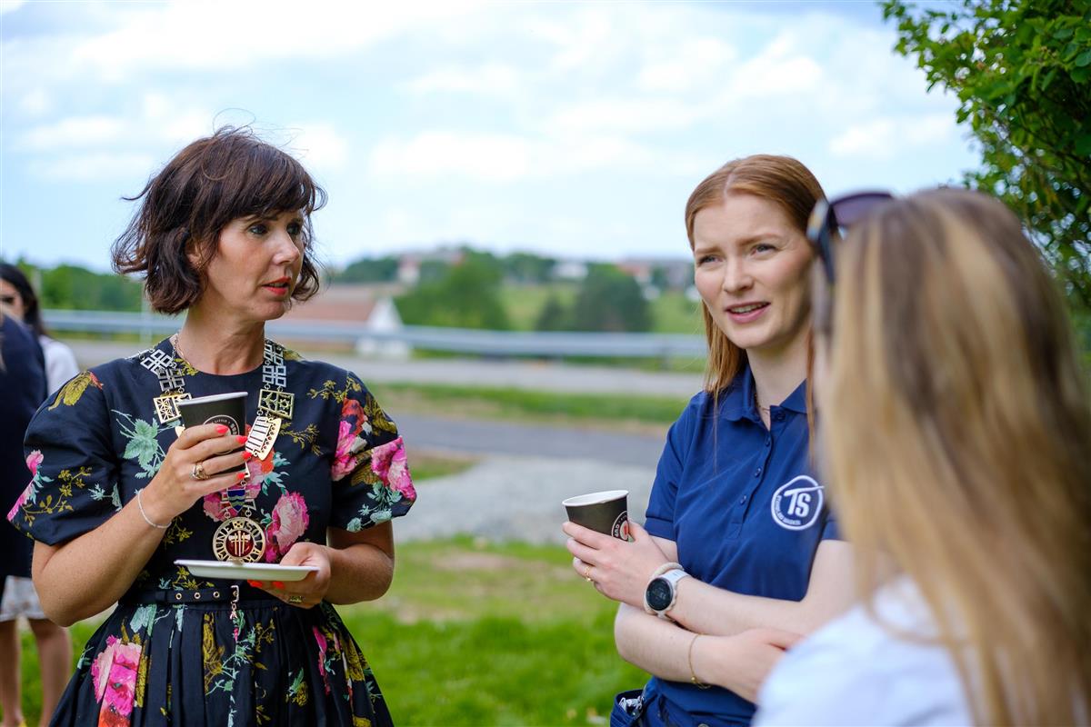 tre damer står og snakker - Klikk for stort bildeOrdfører i Sola kommune, Janne Stangeland Rege er imponert av arbeidet entreprenør Stangeland Maskin har utført. Øyvind Nesvåg