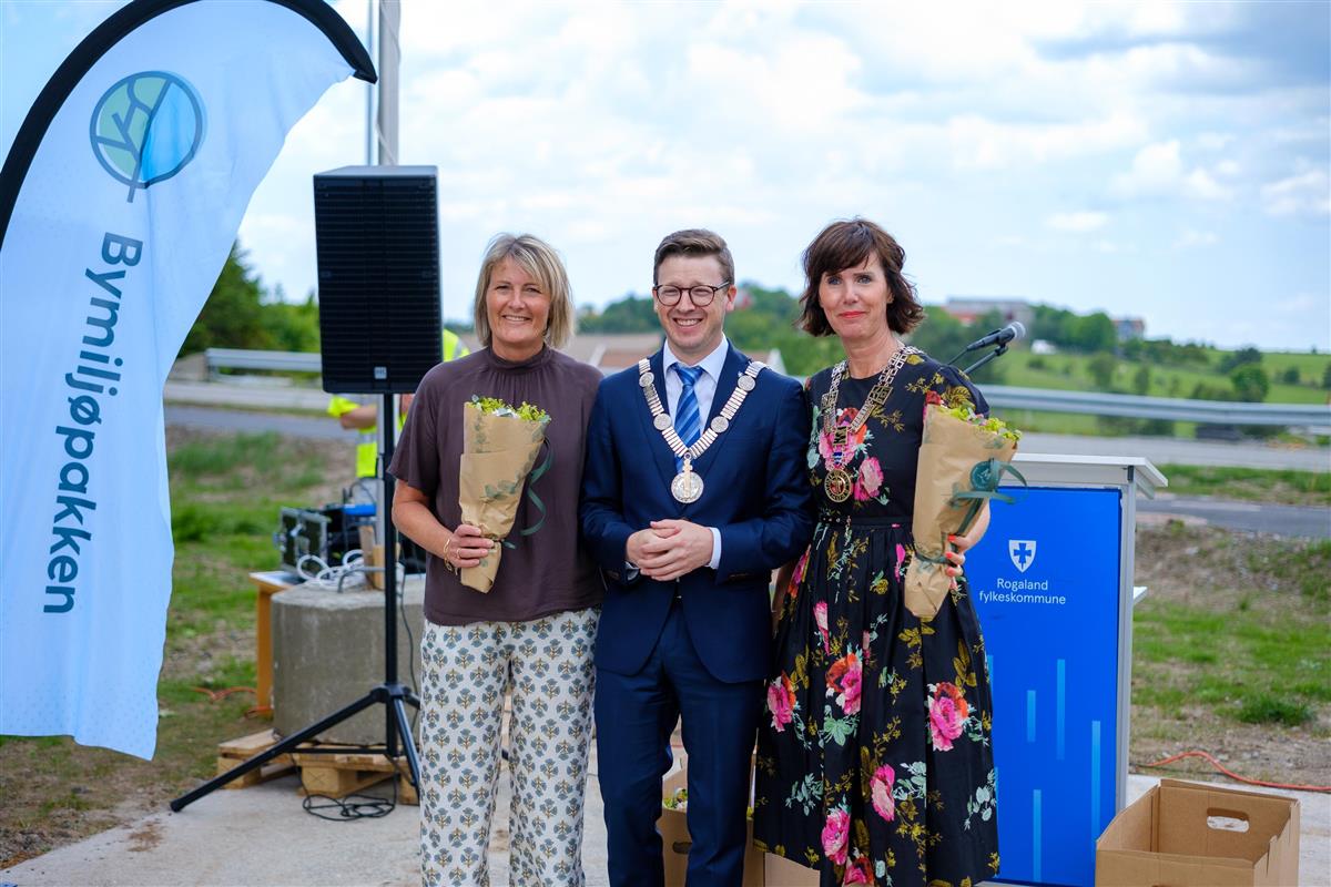 to kvinner og en mann holder blomster - Klikk for stort bildeRektor ved Håland skole, fylkesordfører i Rogaland fylkeskommune og ordfører i Sola kommune var alle godt fornøyde med resultatet. Øyvind Nesvåg