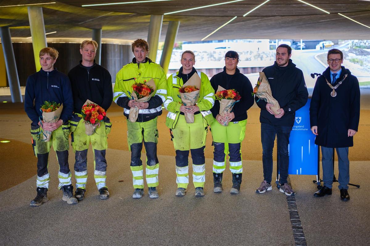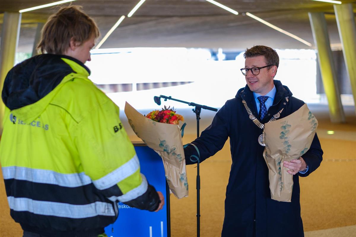 Fylkesordføreren delte ut blomster til alle de som har tatt fagbrev under byggeperioden.