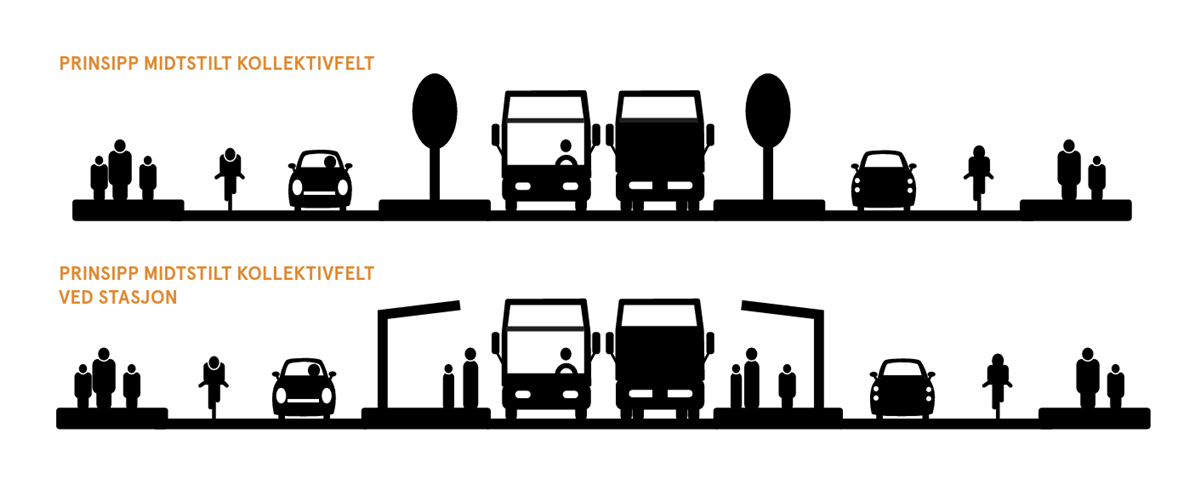 Midstilt kollektivfelt får egne kjørefelt for bussene i midten av veien, med blandet trafikk på hver side og sykkel- og gangvei helt ytterst.Parallellført kollektivfelt