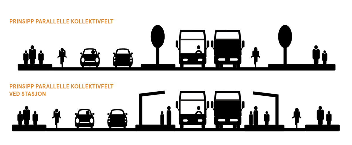 Parallellført kollektivfelt får egne kjørefelt for bussene på den ene siden av veien, blandet trafikk på den andre siden av veien og med sykkel- og gangvei helt ytterst.Universell utforming
