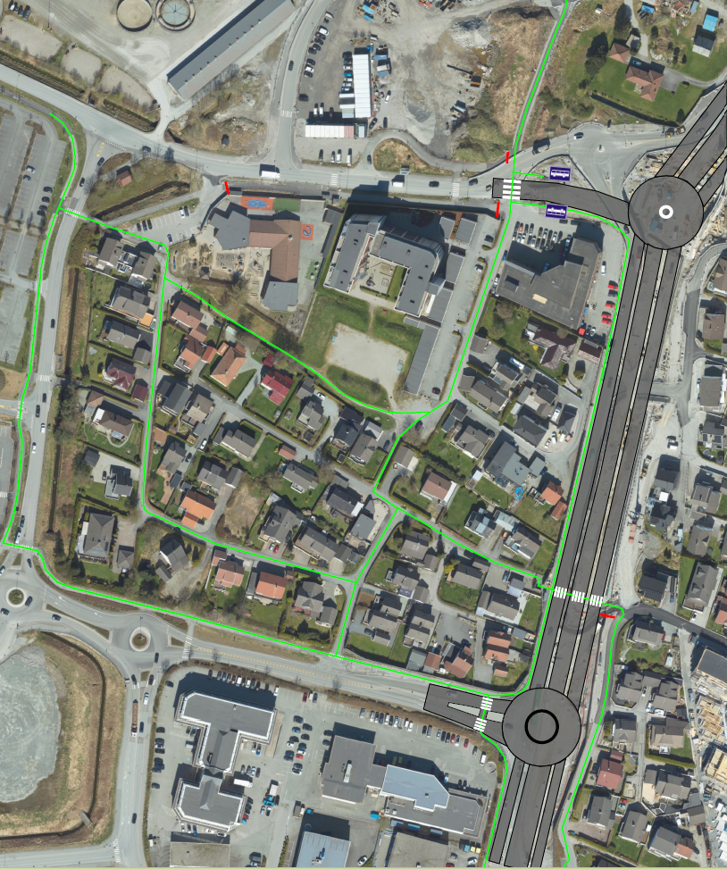 Bildet er fra modellen vi bygger etter og viser den nye sammenbindingen av Hans og Grete stien i nord med Kari Trestakk vei lengst sør i bildet.