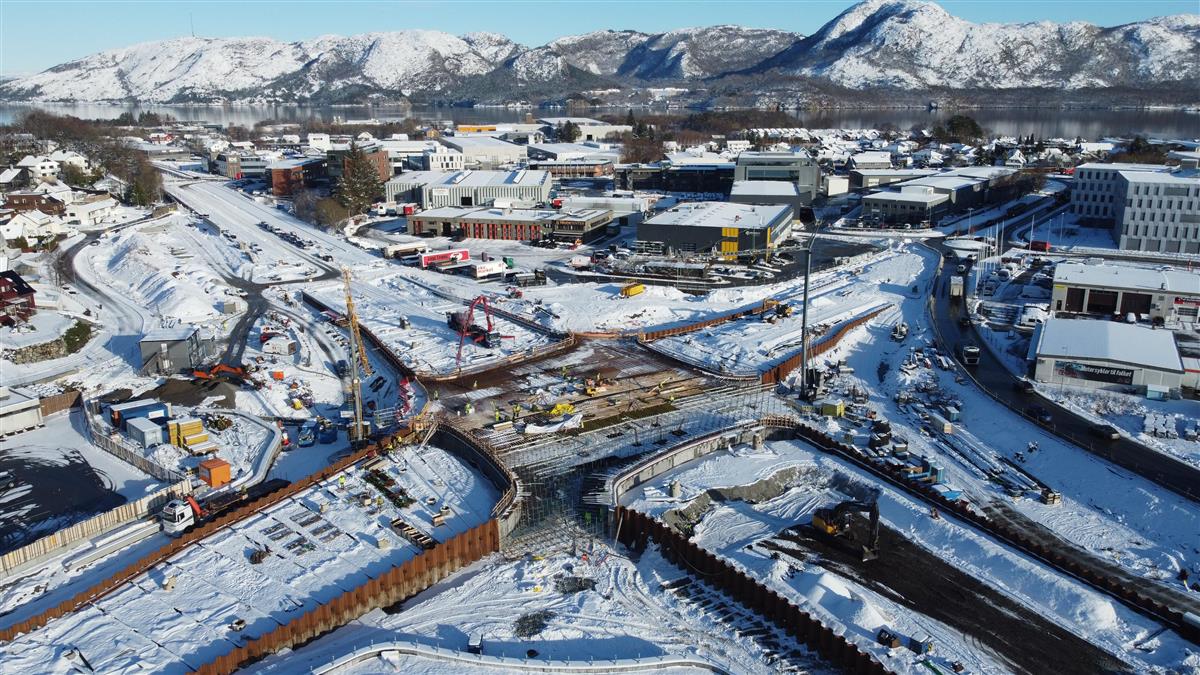Arbeidene i det store krysset går etter planen. Bunnplata til undergangen er støpt og Foruskanalen er lagt i rør og åpnet igjen. Denne høsten har vi fått opp alle veggene til undergangen og har begynt å fylle opp med masse inntil veggene. I januar begynner betongentreprenøren med å sette opp reisverket til topplata/taket til undergangen. Selve topplata er planlagt i uke 13.