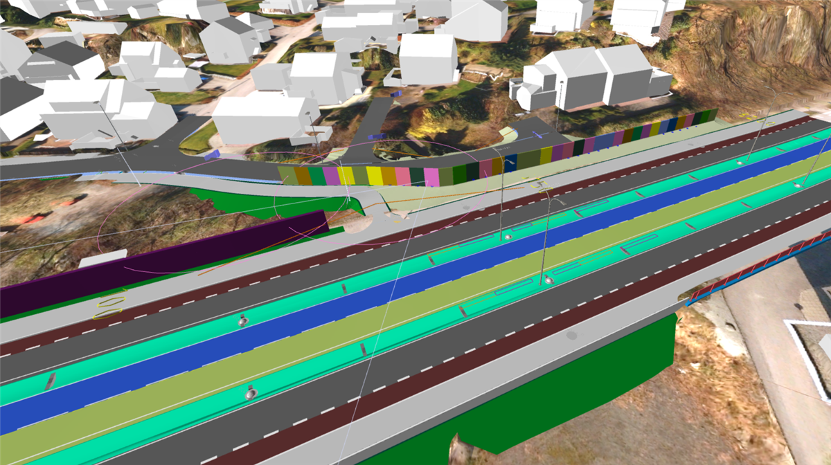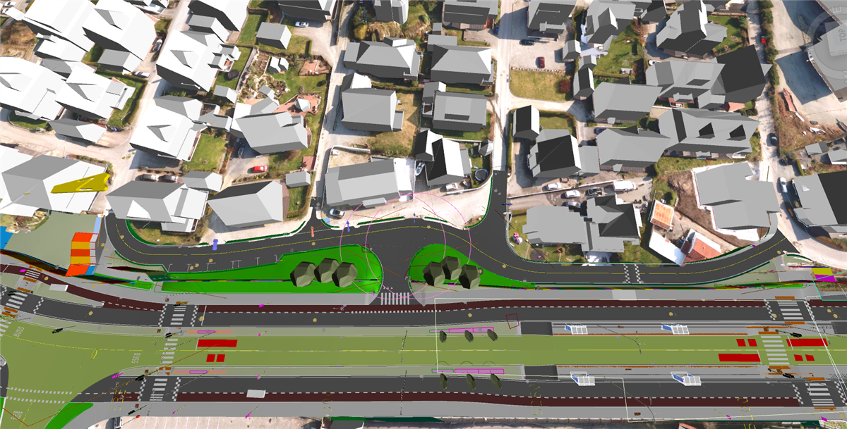 Bildet er fra modellen vi bygger etter og viser den nye sammenbindingen av Hans og Grete stien i nord med Kari Trestakk vei lengst sør i bildet.