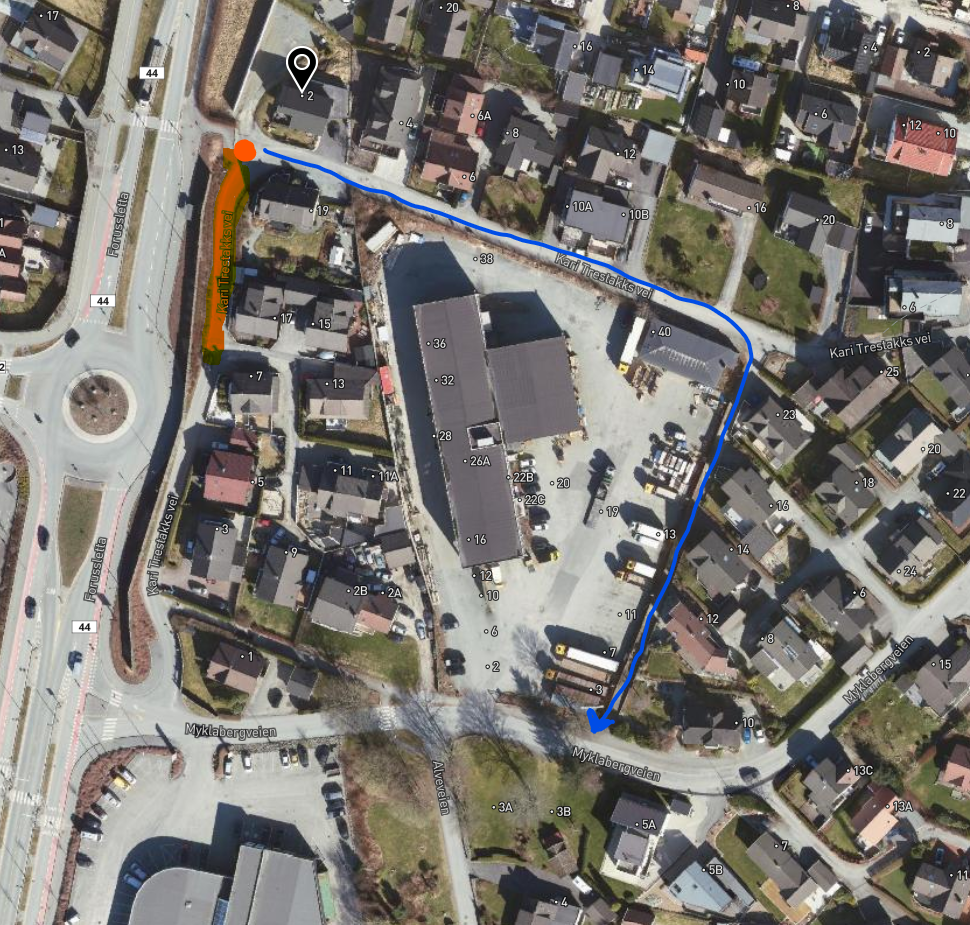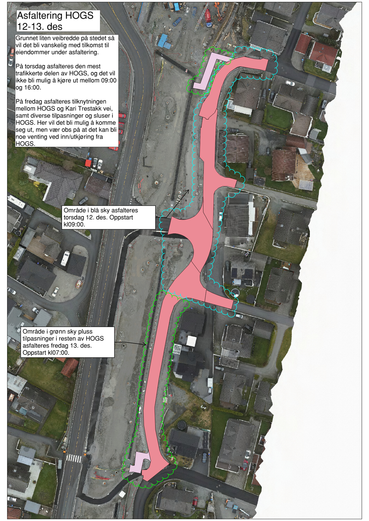 I Kari Trestakk vei er vi nå ferdig med å bytte ut de kommunale vannrørene og veien er bygget opp igjen. Her gjenstår kantstein og asfaltering som ikke har vært mulig å starte opp på grunn av frost i bakken. Entreprenøren starter opp med å sette kantstein denne uken. På grunn av frostperioden som har vært, har asfaltentreprenøren et stort etterslep og vi får ikke asfaltert før jul. Asfaltering er planlagt 03.01.24. Det blir lagt 1 lag asfalt i første omgang.