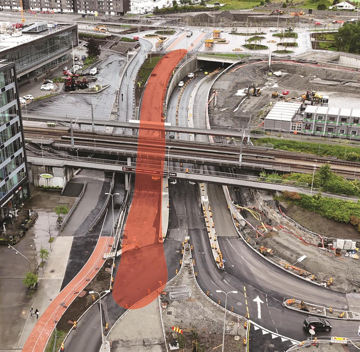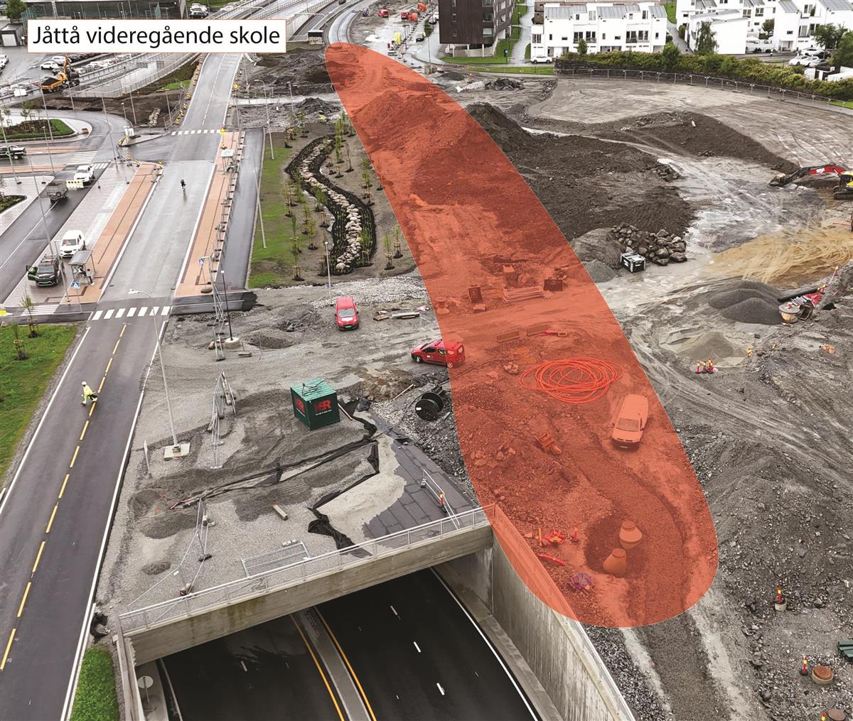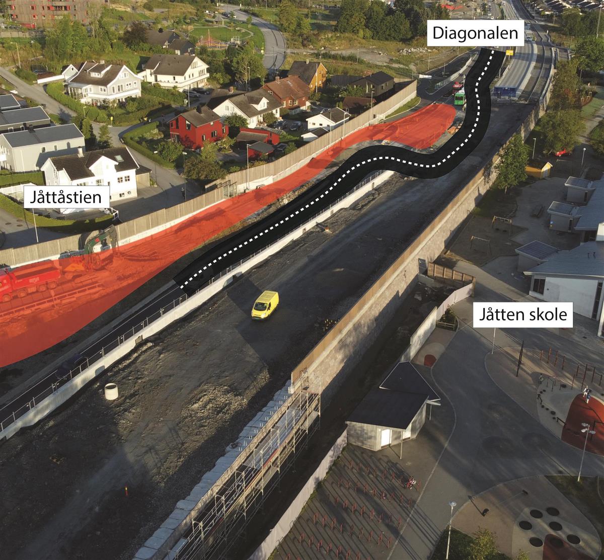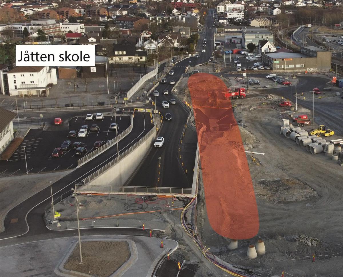 På vestsiden av det nye lokket holder vi på å bygge gang- og sykkelfelt fra Austtunsletta til Diagonalen.Boganesveien ved Jåtten skole
