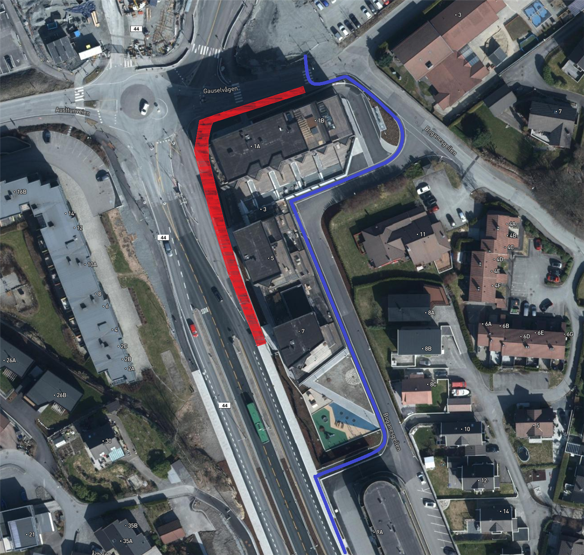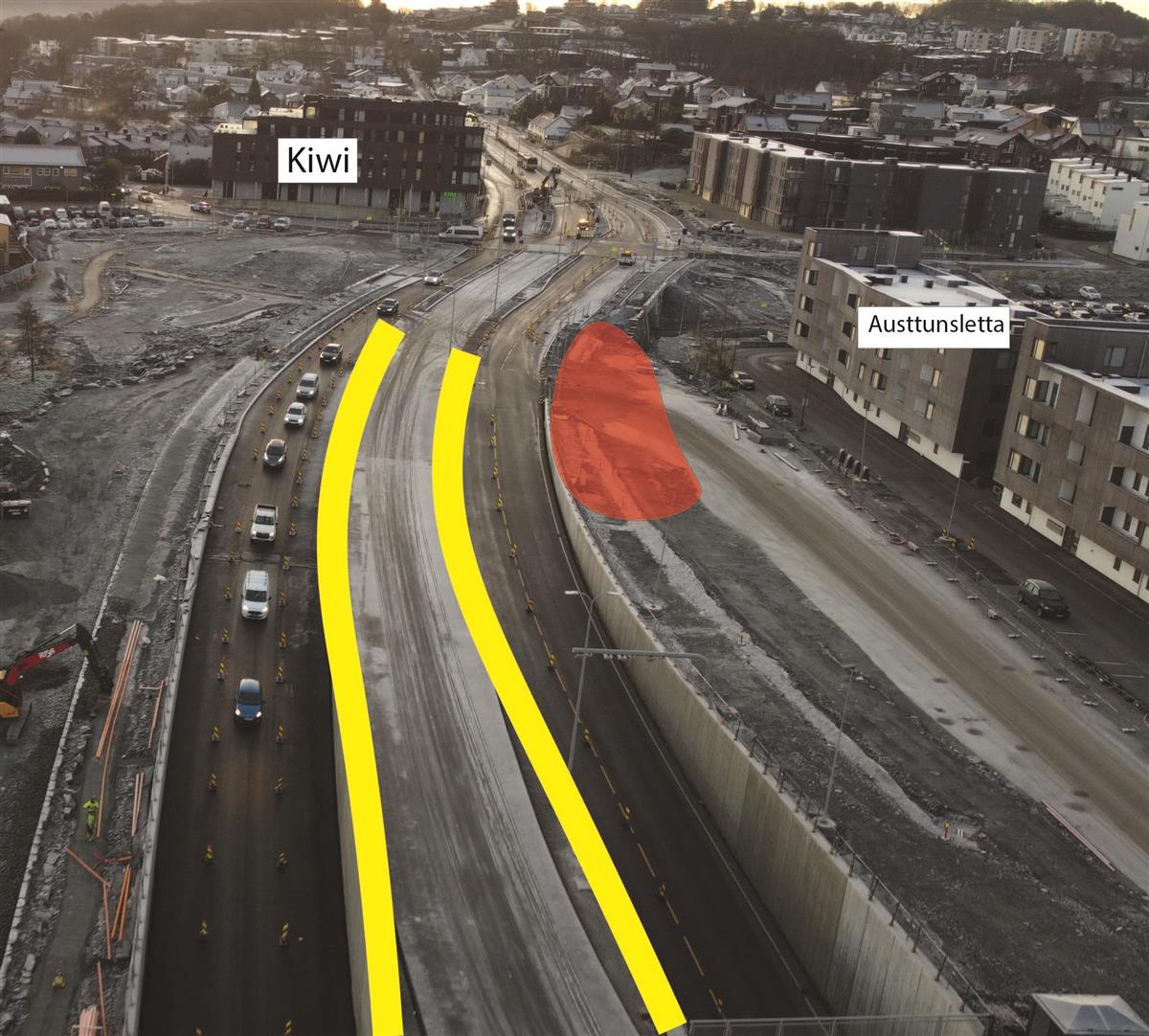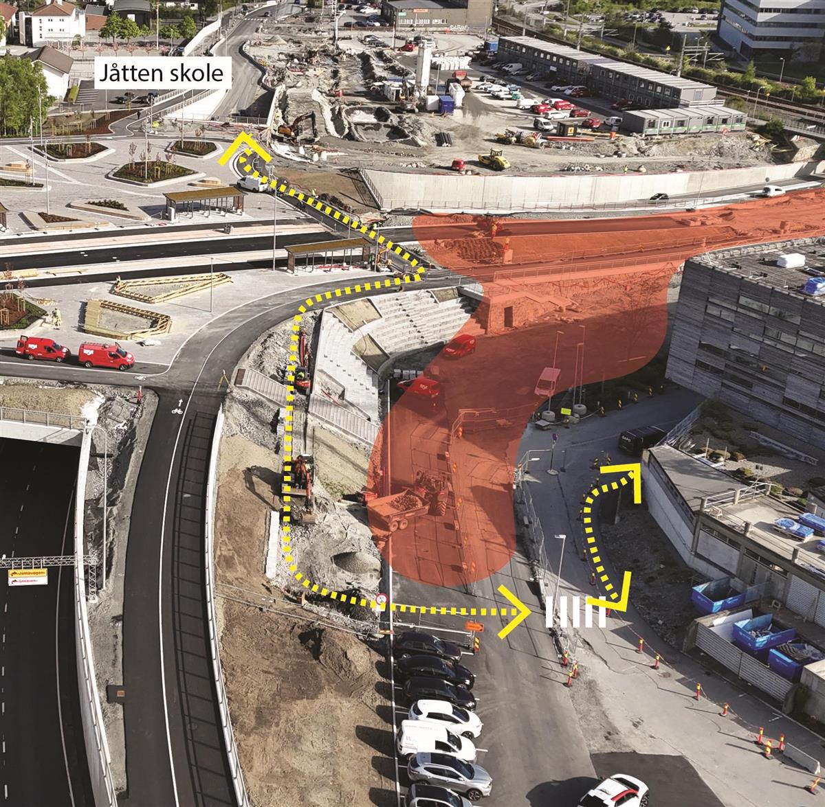 Ved Austtunsletta holder vi på å tilbakeføre parkområde som i byggeperioden har blitt benyttet som midlertidig parkeringsområde. I dette området holder vi også på å tilbakeføre private parkeringsplasser. Fra Austtunsletta mot Diagonalen etablerer vi gang- og sykkelvei, samt vi skal koble oss på eksisterende gangvei ved Jåttåstien.