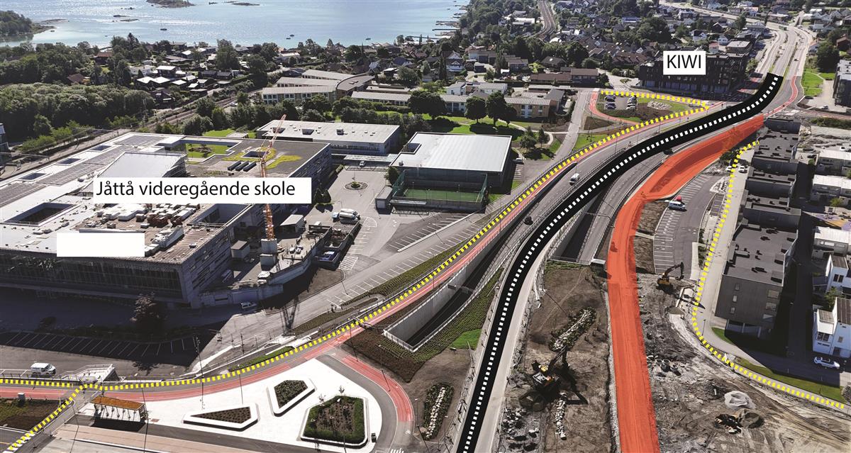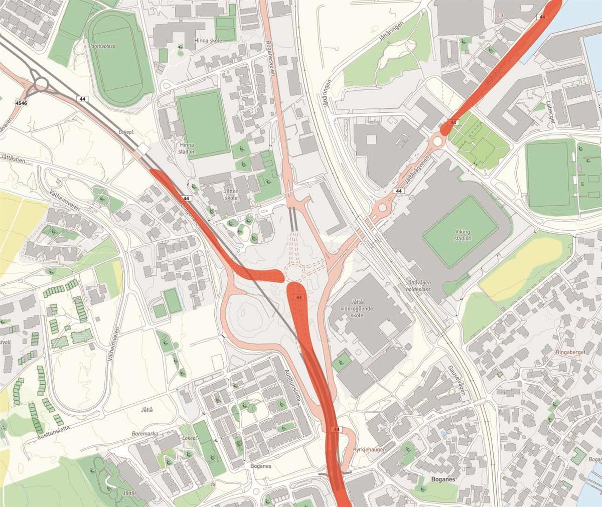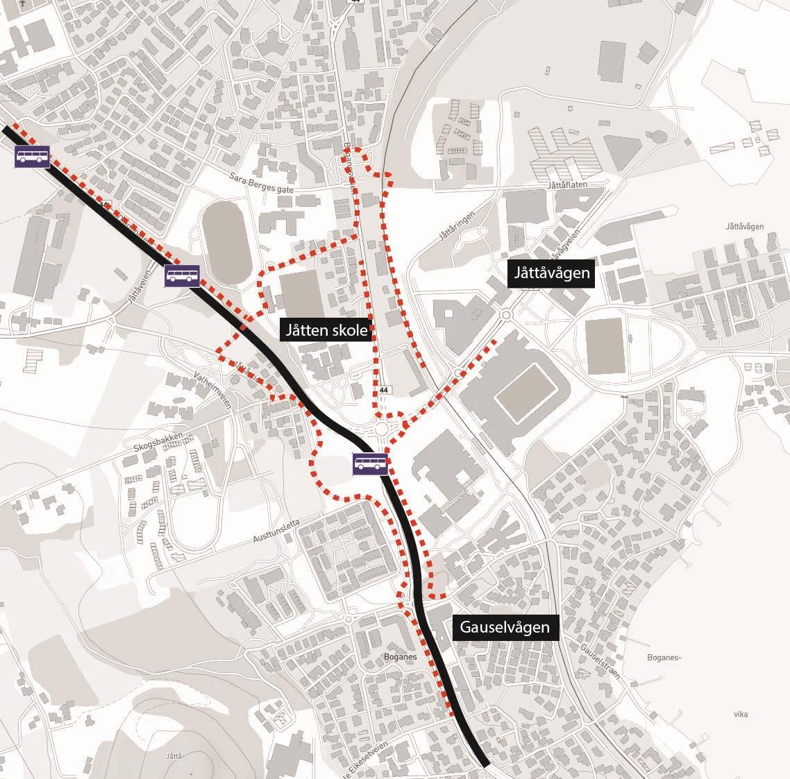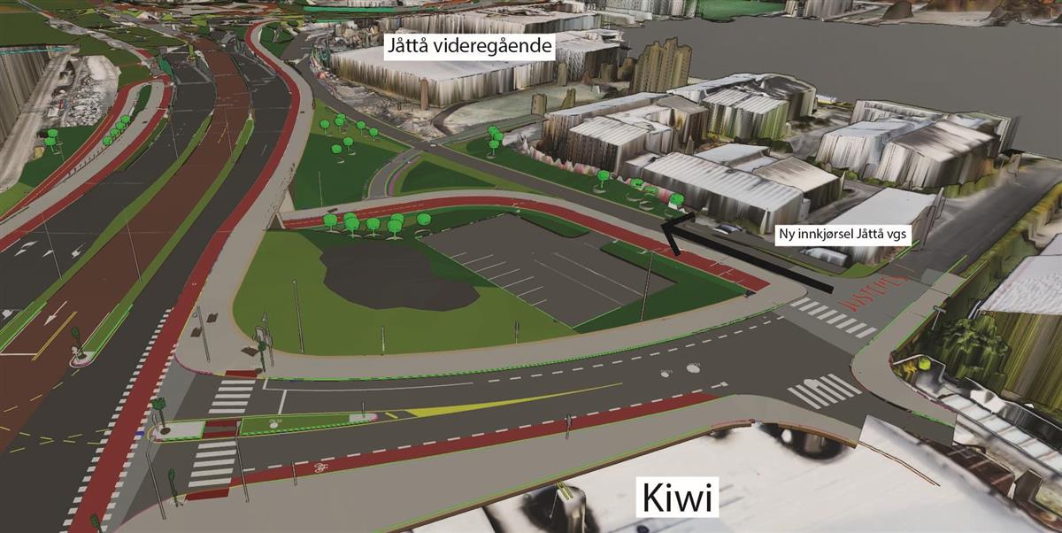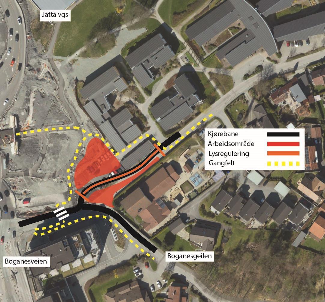 På østsiden og vestsiden av Boganesveien skal vi bygge gang- og sykkelfelt i et område. Uteområde langs Jåtten skole skal også tilbakeføres.Ny vei gjennom Jåttåflaten