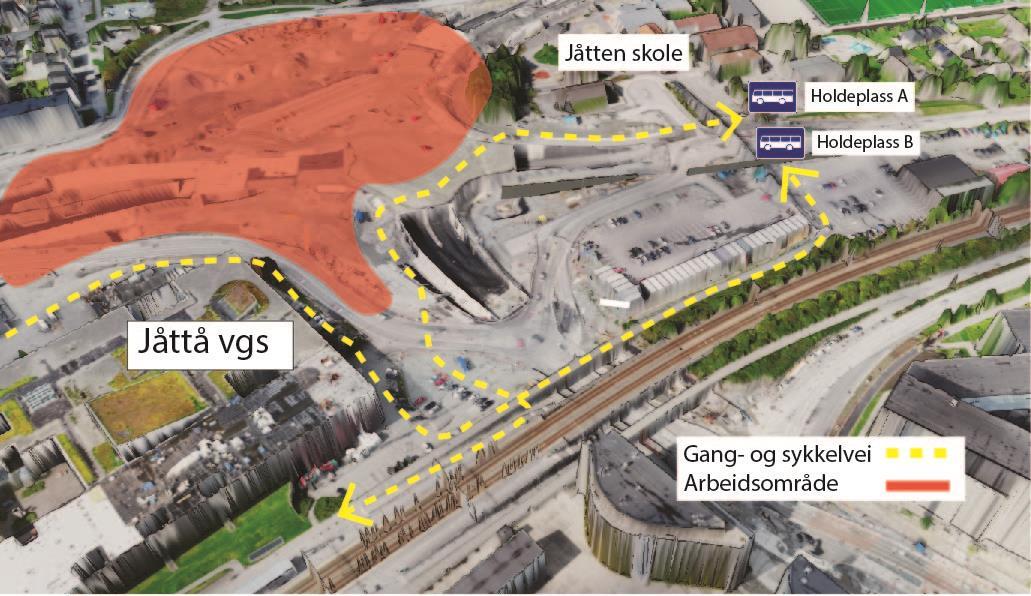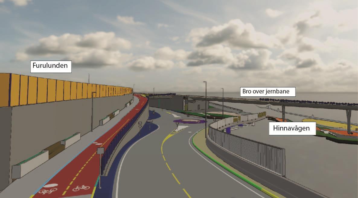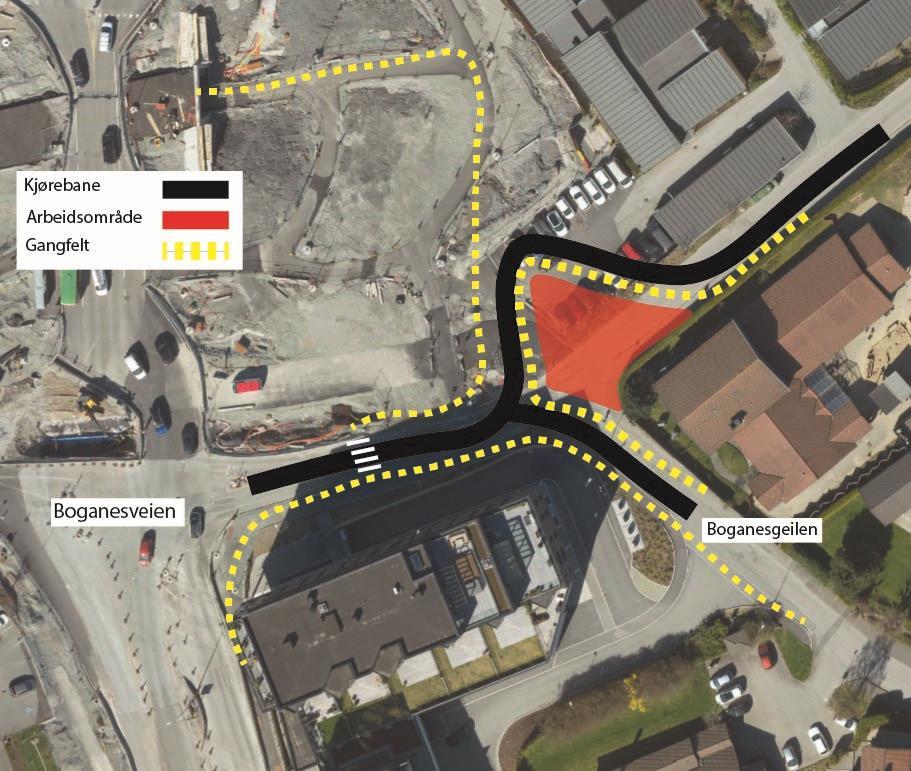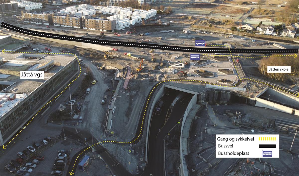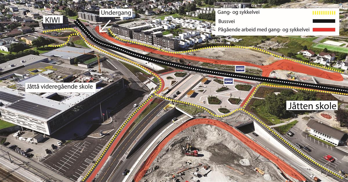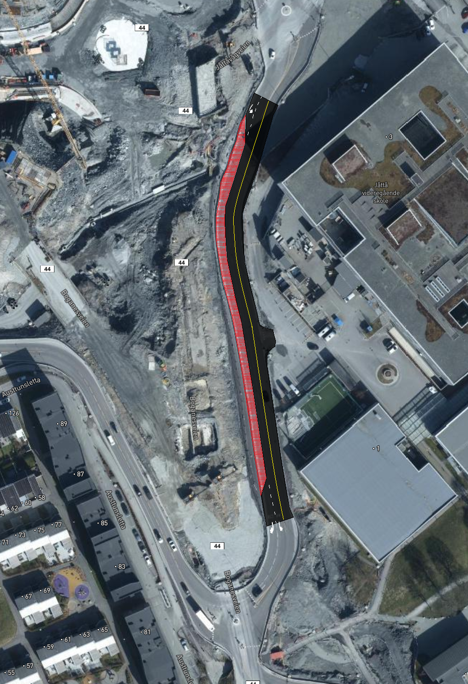 På østsiden og vestsiden av Boganesveien skal vi bygge gang- og sykkelfelt i et område. Uteområde langs Jåtten skole skal også tilbakeføres.Ny vei gjennom Jåttåflaten