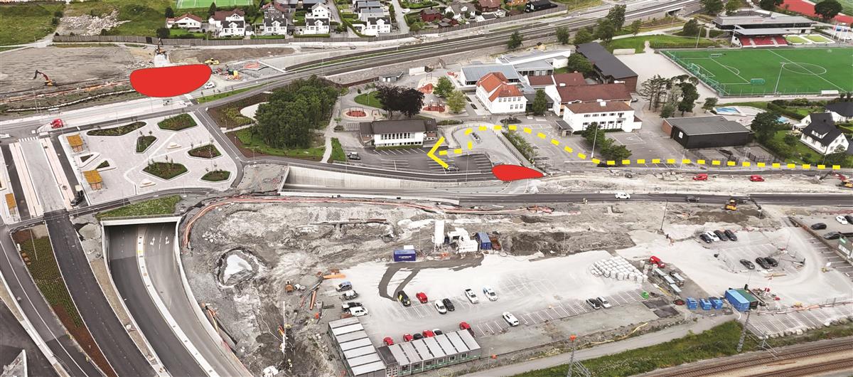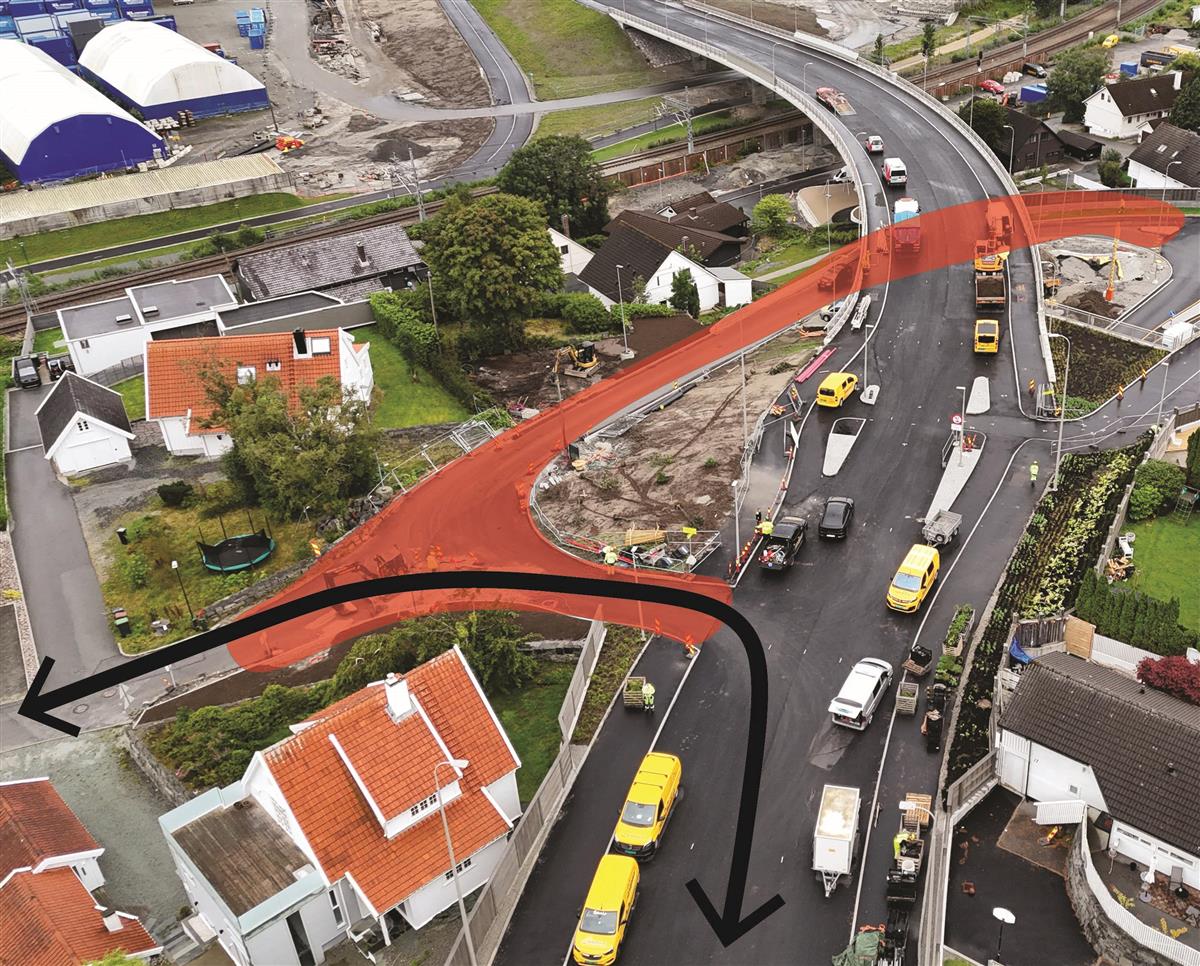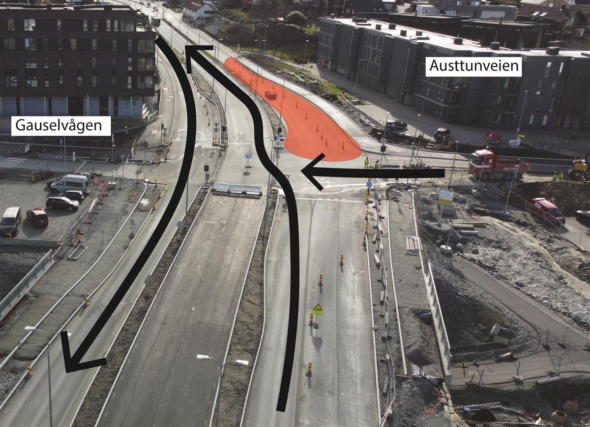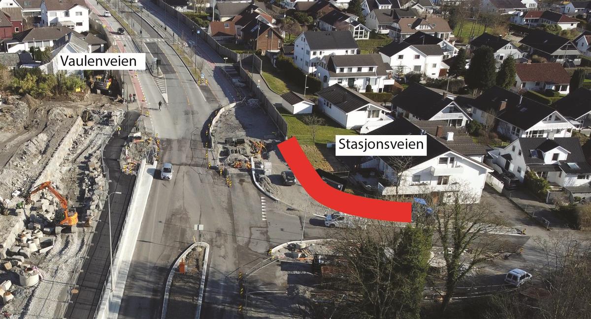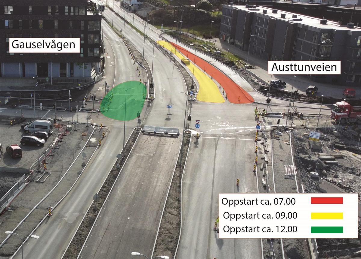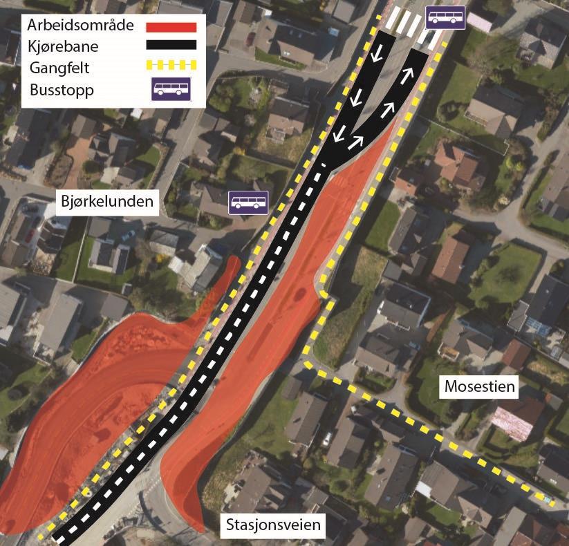 I Stasjonsveien holder vi på å bygge systemskifte for buss. I dette området vil det bli arbeid i store deler av juli, men uke 30 er hovedsakelig fri for anleggsarbeid. Området skal asfalteres i uke 30 og 31. I uke 31 skal vi også teste lysregulering for systemskifte til buss. Når lysreguleringen testes, vil den stå å blinke gult i noen uker. Lysreguleringen tas først i bruk når Bussveien åpnes fra Stasjonsveien til Gauselvågen.