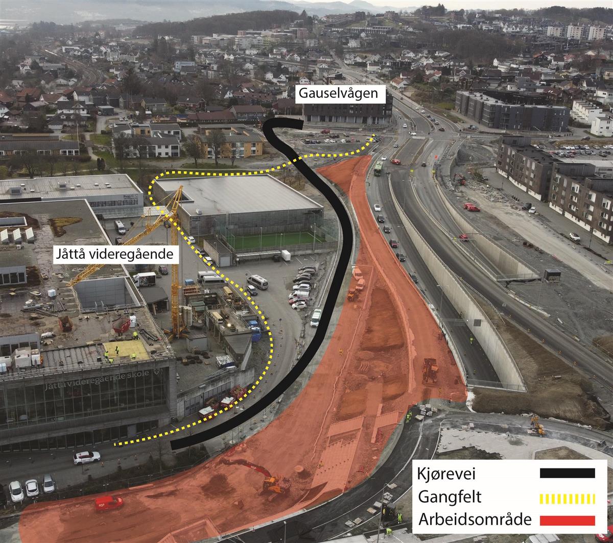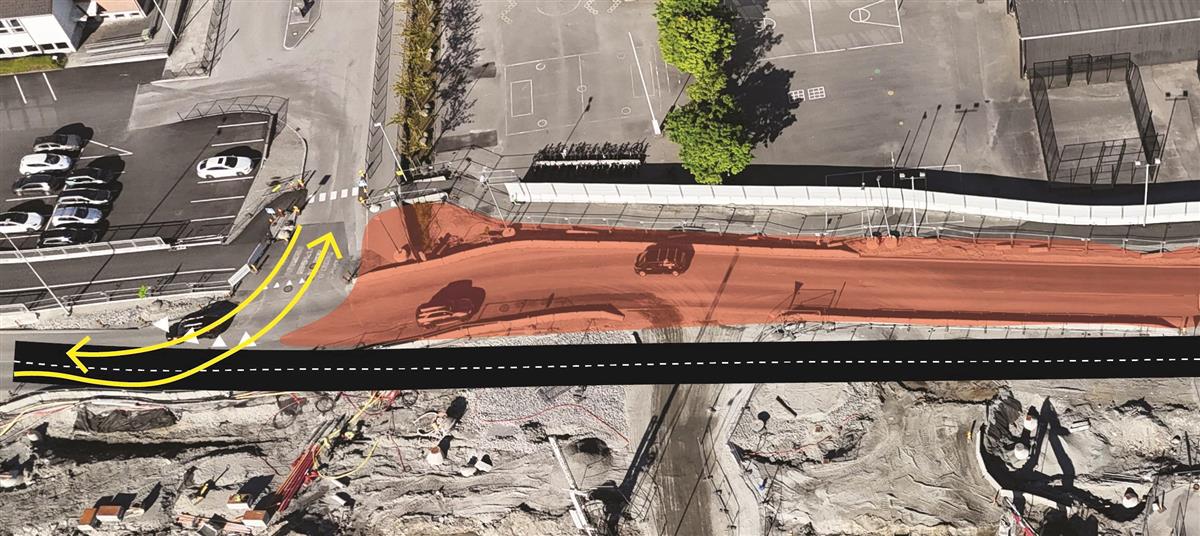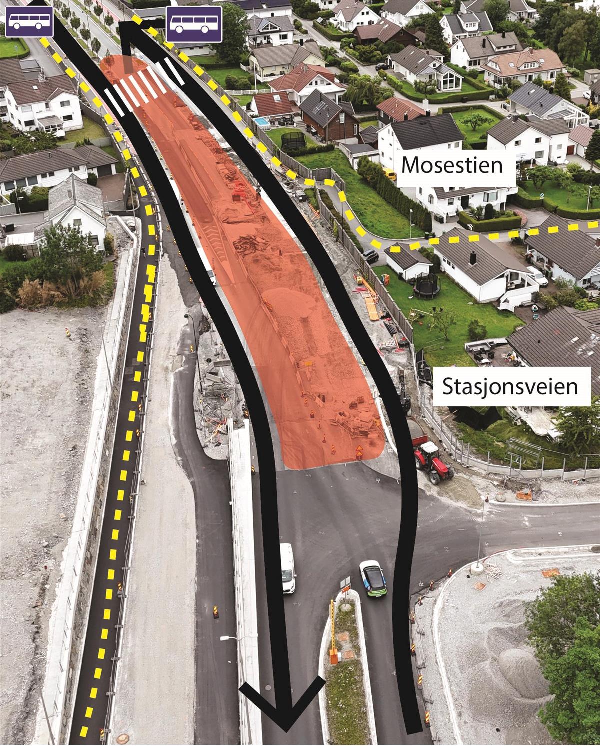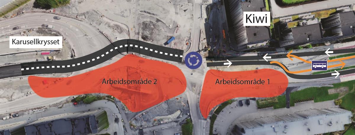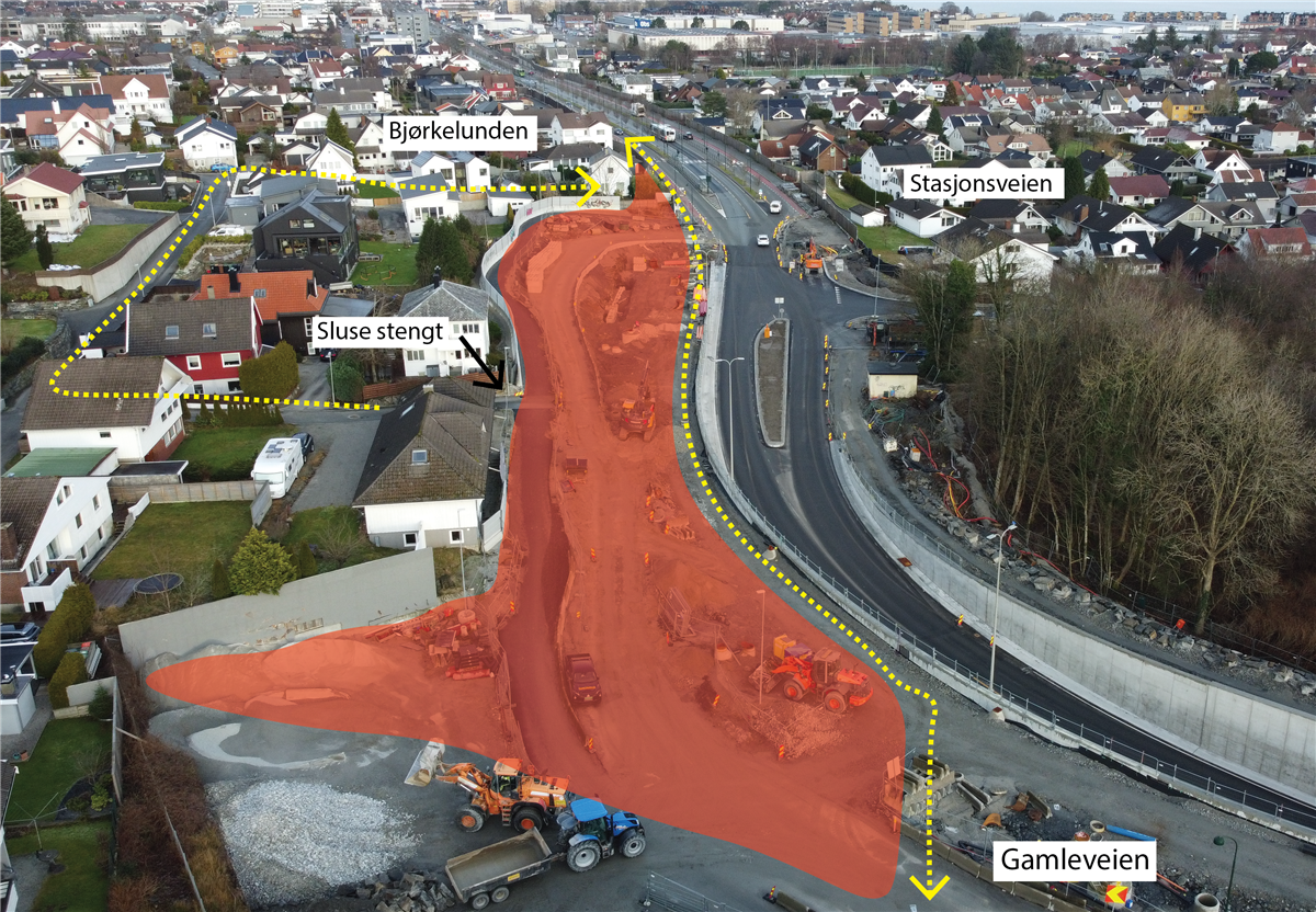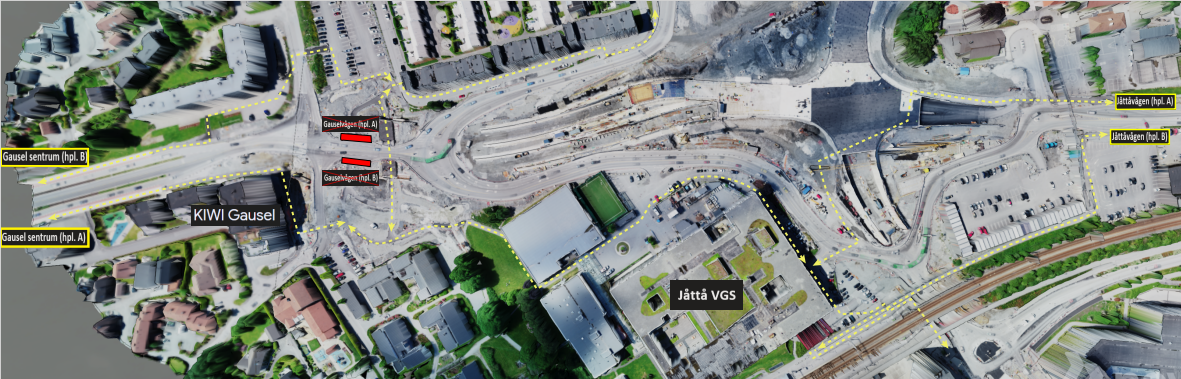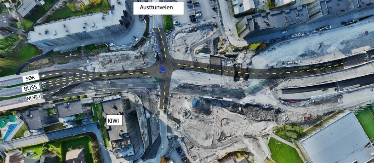 I Stasjonsveien holder vi på å bygge systemskifte for buss. I dette området vil det bli arbeid i store deler av juli, men uke 30 er hovedsakelig fri for anleggsarbeid. Området skal asfalteres i uke 30 og 31. I uke 31 skal vi også teste lysregulering for systemskifte til buss. Når lysreguleringen testes, vil den stå å blinke gult i noen uker. Lysreguleringen tas først i bruk når Bussveien åpnes fra Stasjonsveien til Gauselvågen.