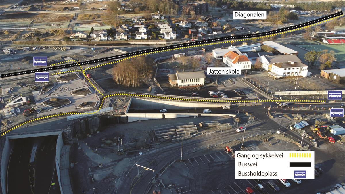 I Jåttåvågveien er store deler av arbeidet ferdig. Det gjenstår noe grøntarbeid, samt etablering av lysregulering hvor bussen skal krysse bilvei. Fra uke 32 vil lysregulering testes og deretter stå i gul blink over en perioder. Lysregulering tas først i bruk når Bussveien åpnes i starten av september.