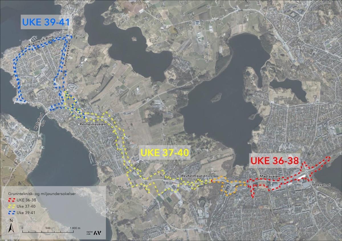 Det vil i forkant av grunnboringer bli gjennomført kabelpåvisning og sjekk på vann- og avløps-ledninger før endelig plassering av borepunkt blir satt. Det planlegges å gjennomføre boringer i løpet av uke 36- 41, 2024. Eventuelle endringer i tidsperiode vil bli varslet til direkte berørte grunneiere. Arbeidet vil primært foregå på dagtid. Det planlegges oppstart lengst inn mot sentrum langs Madlaveien og videre opp langs Revheimsveien mot krysset på Sundekrossen og til slutt i Kvernevikveien og Kvernevik ring. Endringer underveis kan forekomme. Det er en del usikkerhet knyttet til nøyaktig hvilke dager de ulike borepunktene vil kunne gjennomføres.