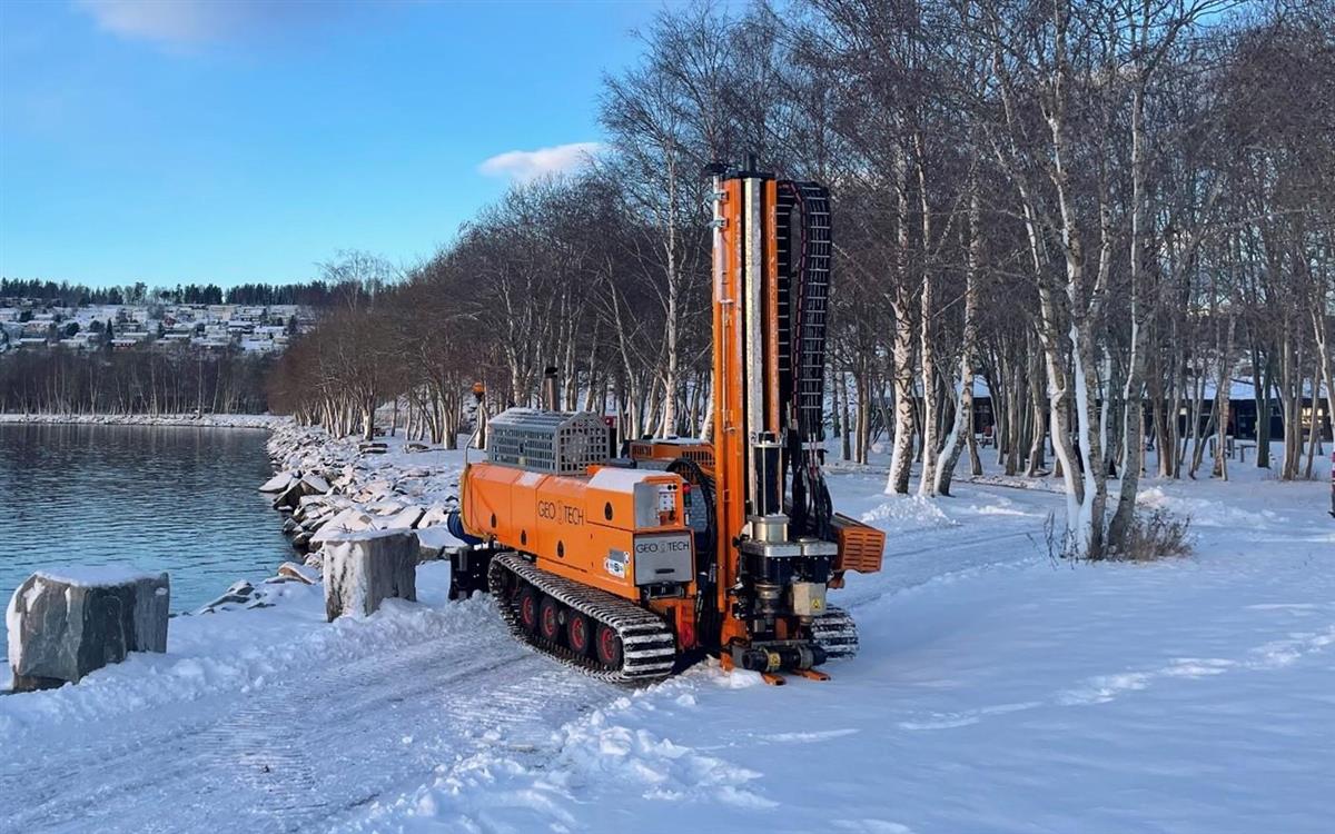 Bildet over viser grunnboringsriggUndersøkelsene er planlagt gjennomført med en beltegående grunnboringsrigg av typen Geotech 605 eller lignende (se bilde nedenfor). Den har følgende vekt og dimensjoner: Vekt ca. 6 tonn, lengde ca. 4,8 m, bredde ca. 2 m, høyde ca. 2,4 m- ved forflytning, ca. 4,8 m med boretårnet i loddrett stilling. Boretid per borepunkt avhenger av grunnforhold og dybde til antatt fjell, samt omfang av prøvetaking. Det må generelt regnes med inntil 3 timer per hull for grunnboringer, og det kan i enkelte tilfeller gå lengre tid.