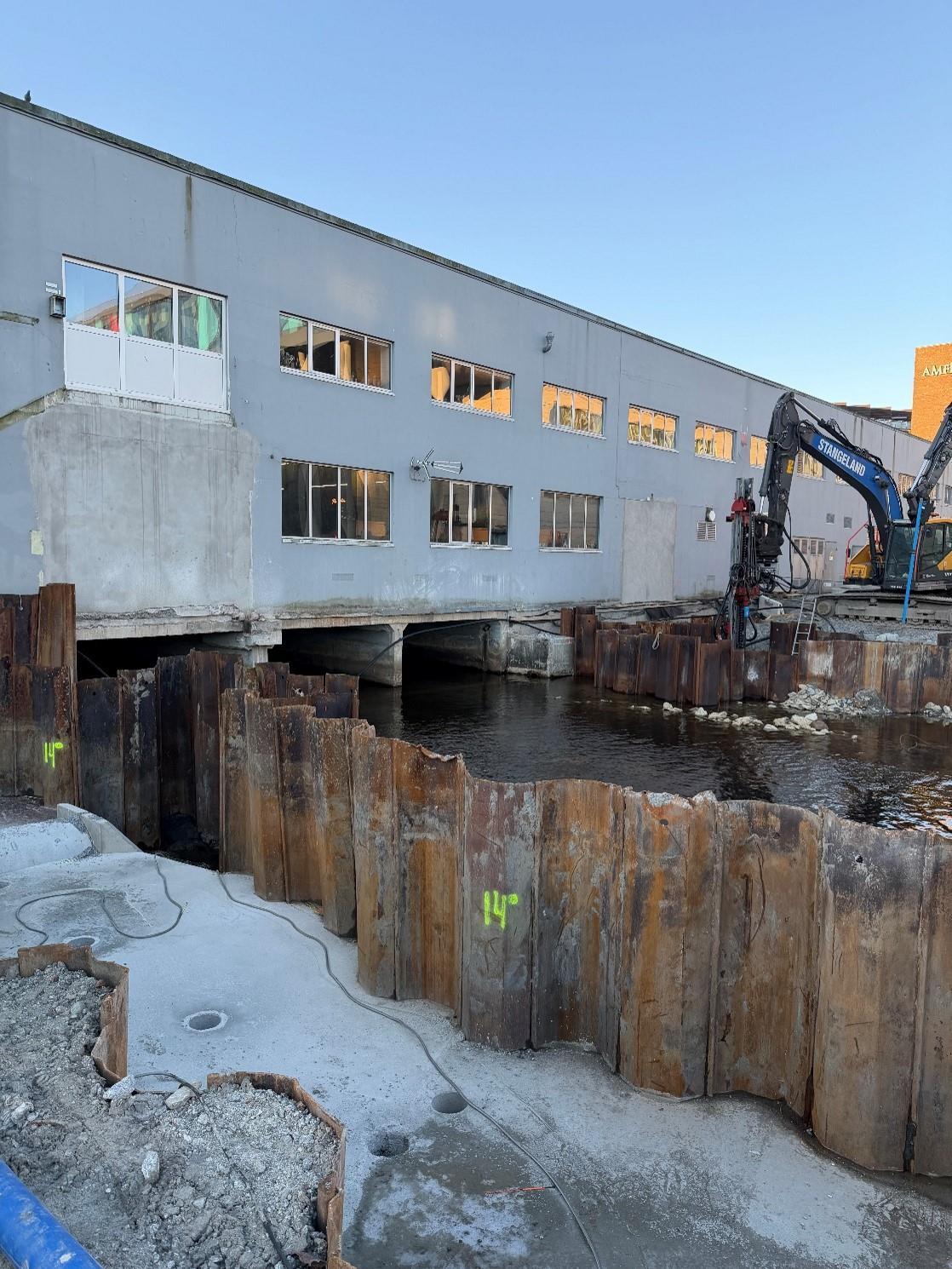 I Julie Eges gate, øst for Holbergs gate, er vi nylig ferdige med å fjerne betongkulverten over Storåna. Det er planlagt utført testpeling fredag 19. og mandag 22. desember. Det blir pause i arbeidene i julen før det er planlagt spunting 5. og 6. januar. Oppstart fundamentering av den nye brua over Storåna er planlagt i uke 3.