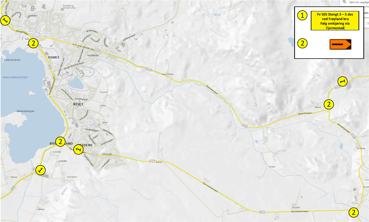 Fylkesvei 505 stengt 3. – 5. desember ved Frøyland bru. Følg omkjøring via Fjermestad