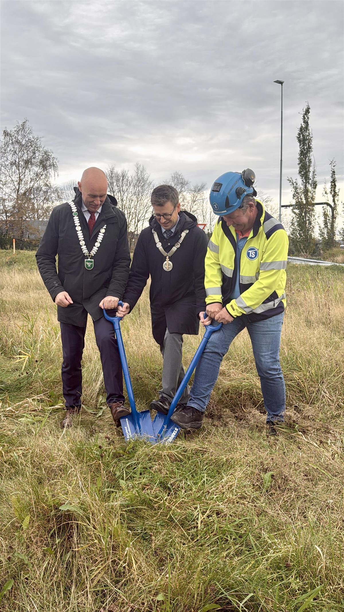 Sandnes-ordfører Kenny Rettore, fylkesordfører Ole Ueland og daglig leder i Stangeland Maskin tar første spadestikk.  - Klikk for stort bildeSpaden i jorden markerer oppstart av oppgraderingen av Oalsgata. Eilin Tvedt-Gundersen