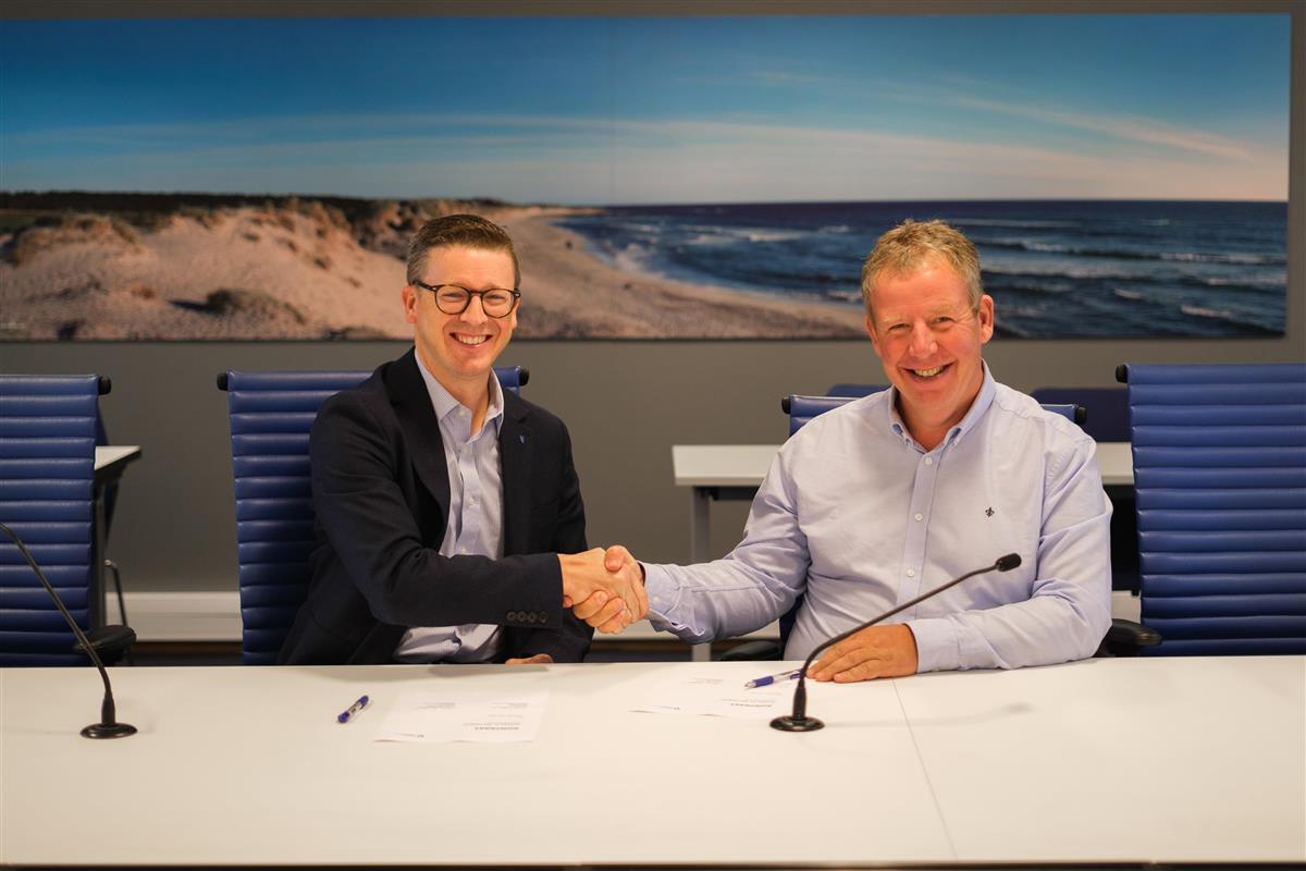 To menn tar hverandre i hånda - Klikk for stort bildeFylkesordfører Ole Ueland (t.v.) og Tommy Stangeland daglig i Stangeland Maskin AS (t.h.) signerte kontrakten. Michelle Folgerø